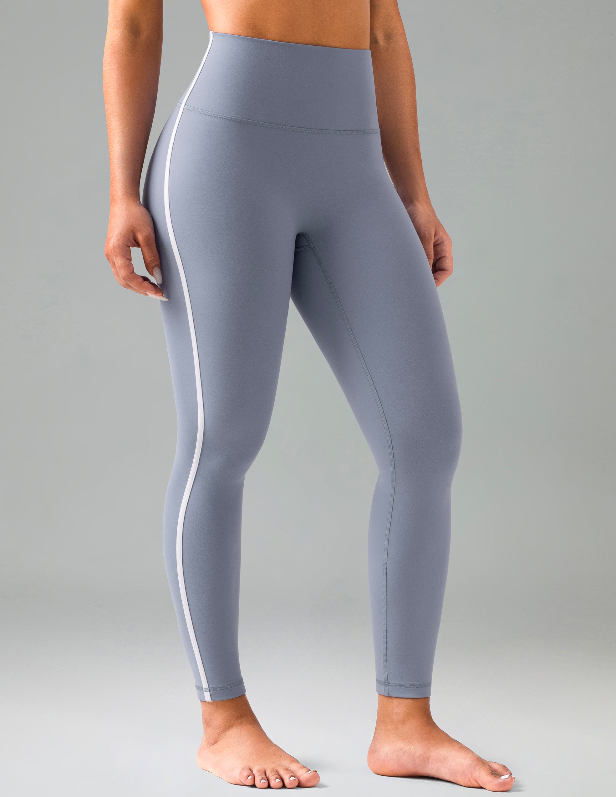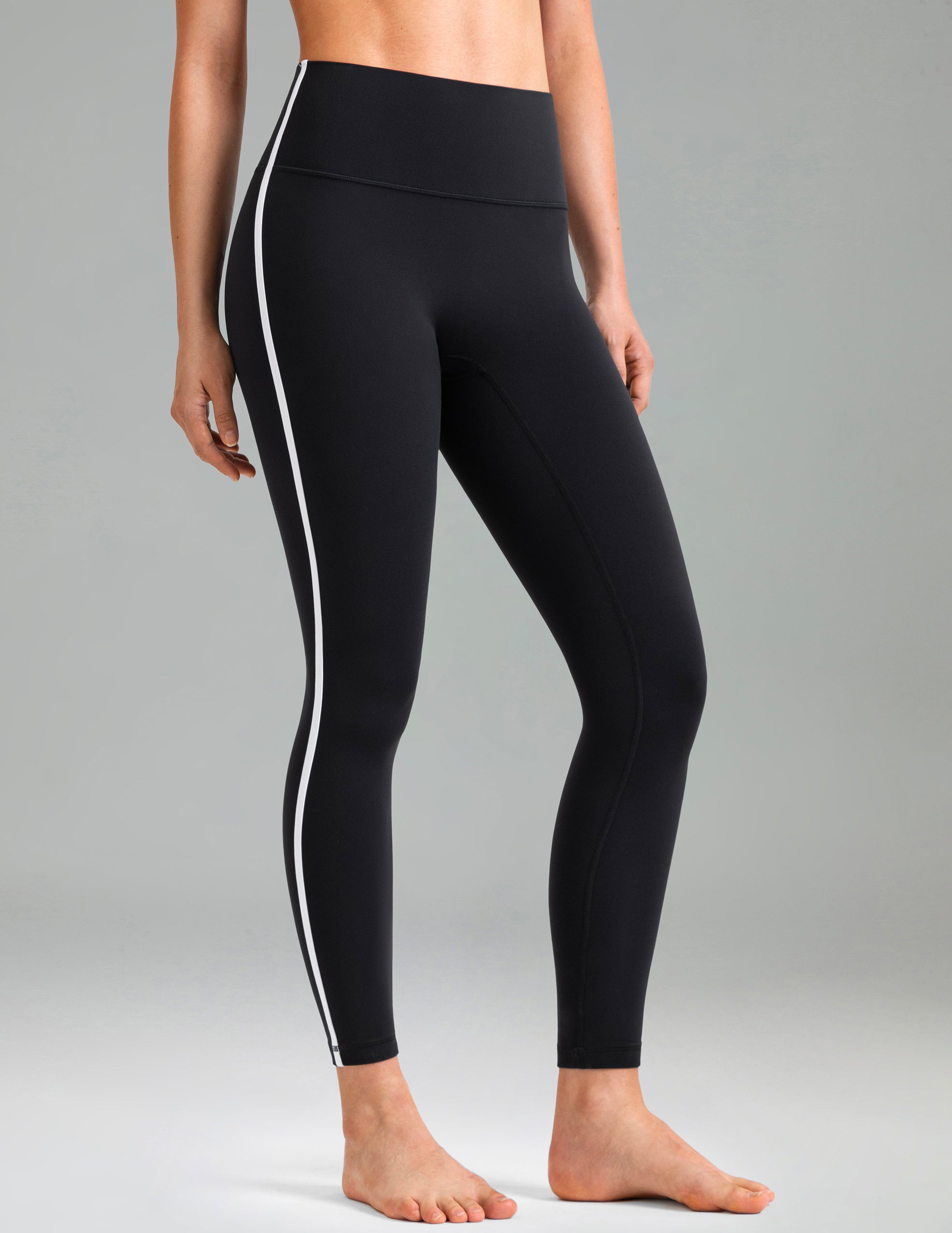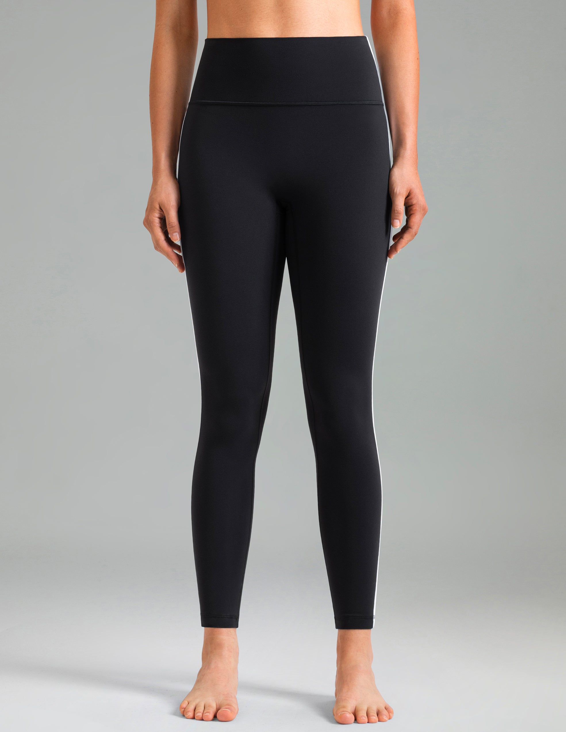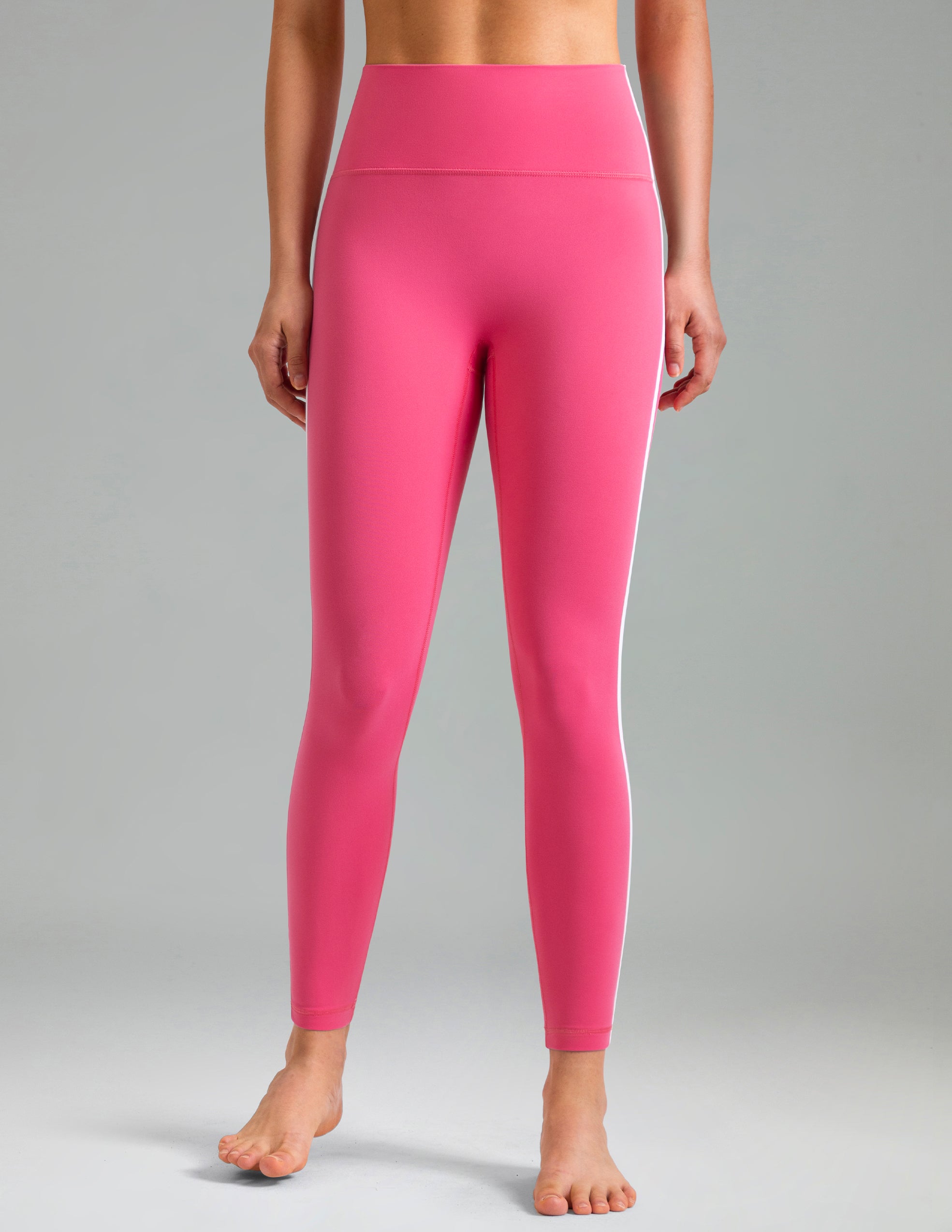 High-waisted, no-front-seam yoga leggings with a 25" inseam. Featuring white contrast side stripes for a retro ‘90s vibe. The back V-shaped seam enhances your curves, while the contouring fit subtly lifts and flatters your silhouette.
