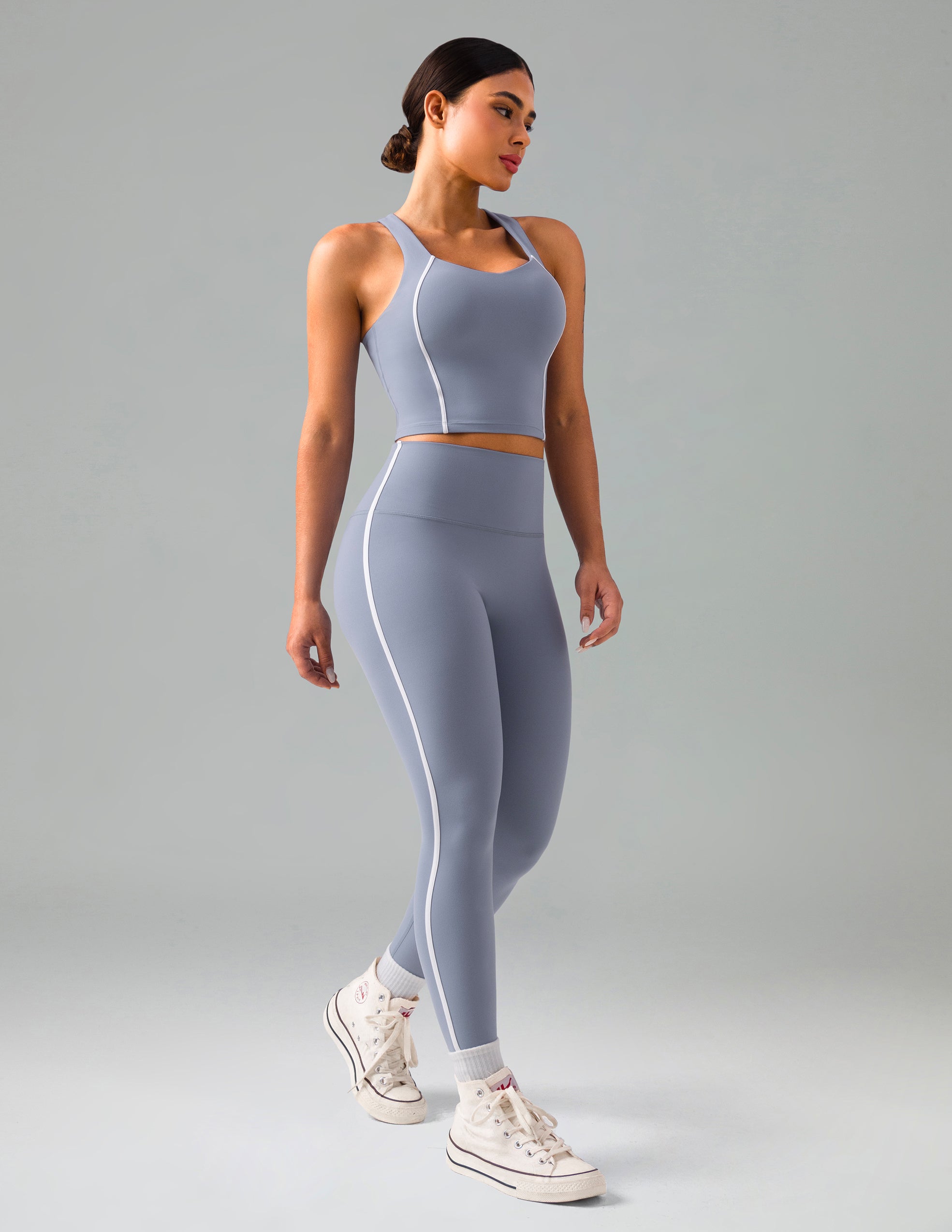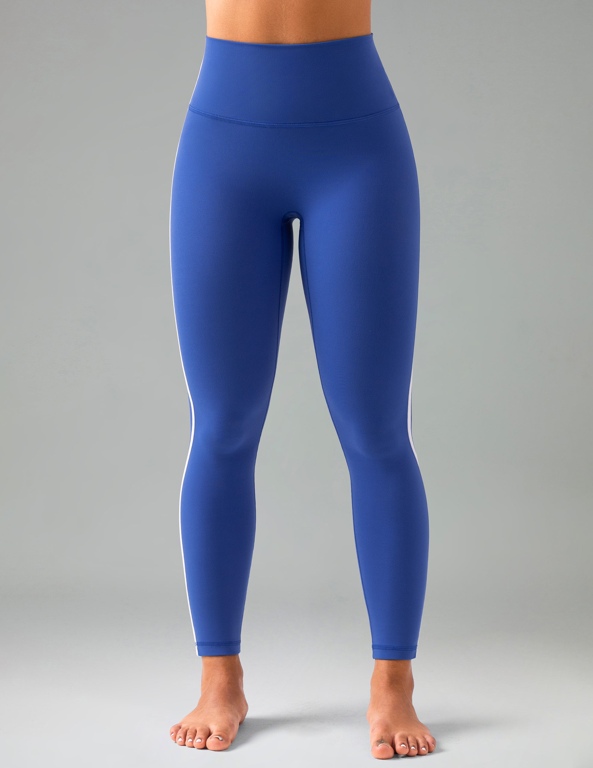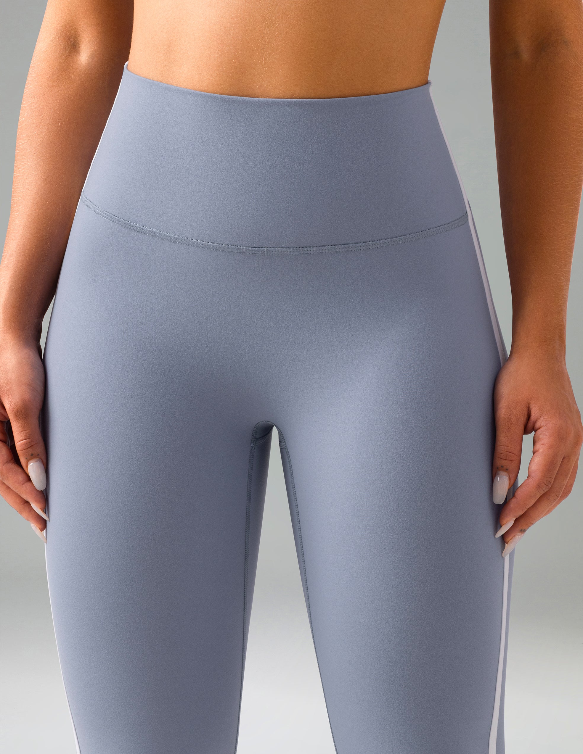 High-waisted, no-front-seam yoga leggings with a 25" inseam. Featuring white contrast side stripes for a retro ‘90s vibe. The back V-shaped seam enhances your curves, while the contouring fit subtly lifts and flatters your silhouette.