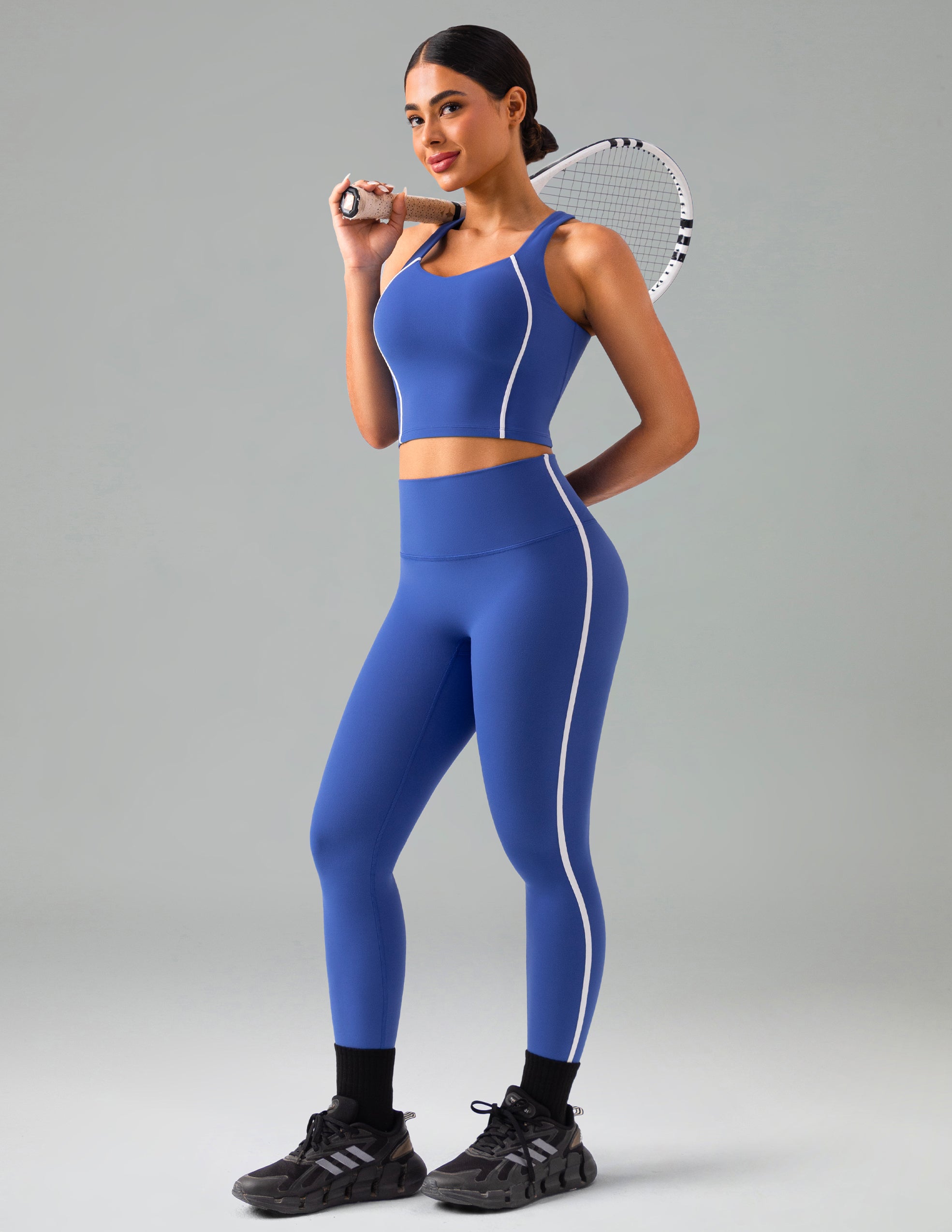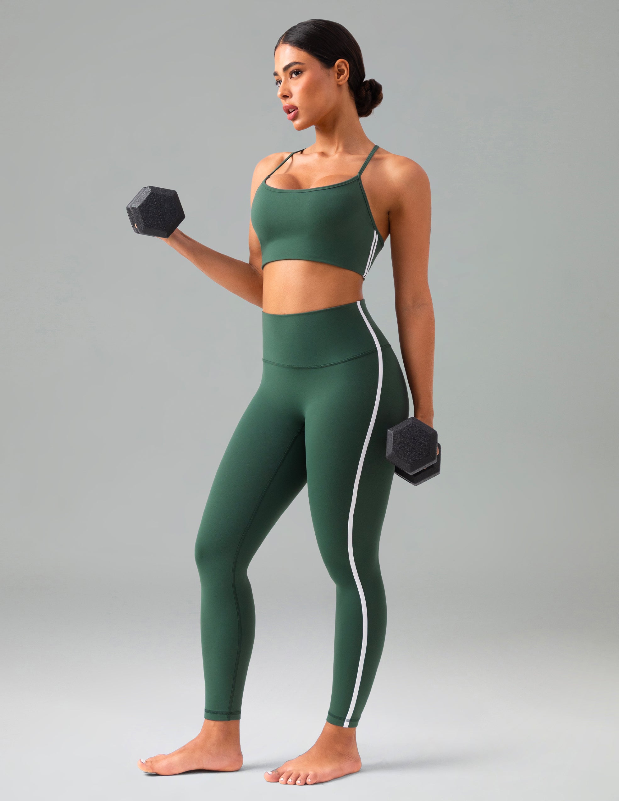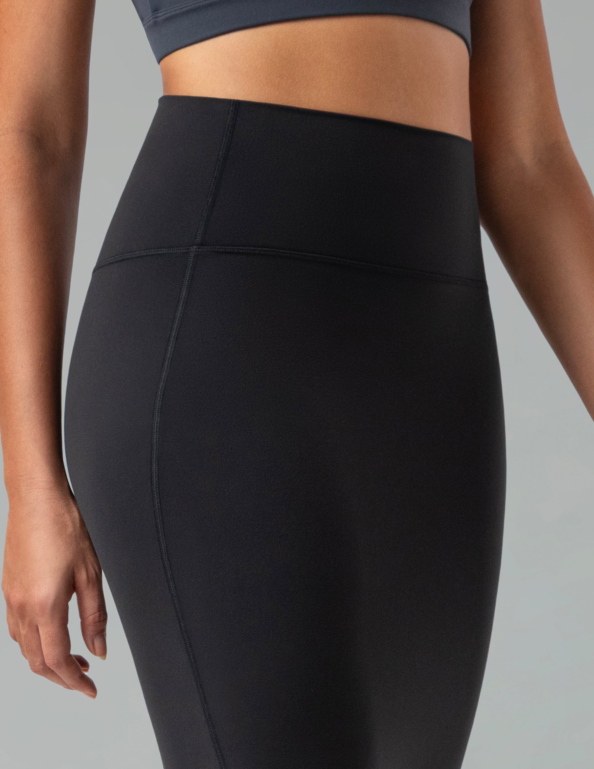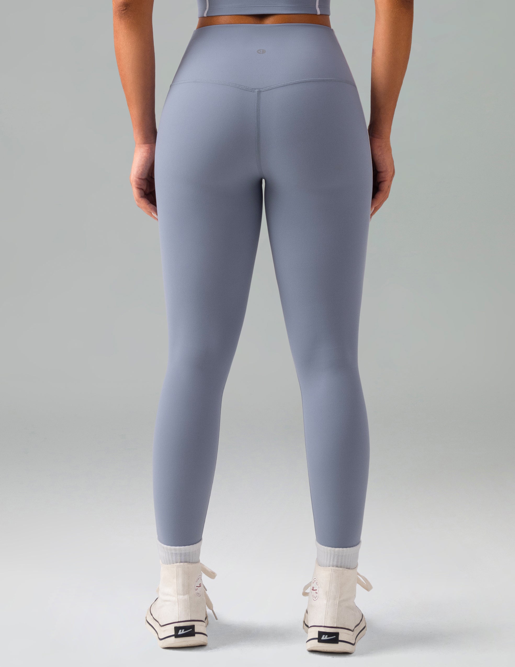 High-waisted, no-front-seam yoga leggings with a 25" inseam. Featuring white contrast side stripes for a retro ‘90s vibe. The back V-shaped seam enhances your curves, while the contouring fit subtly lifts and flatters your silhouette.
