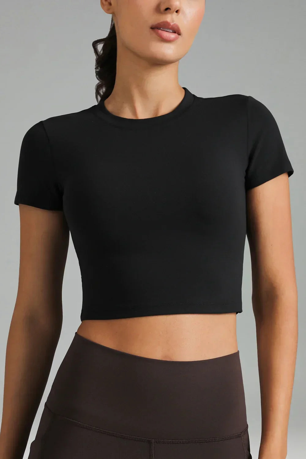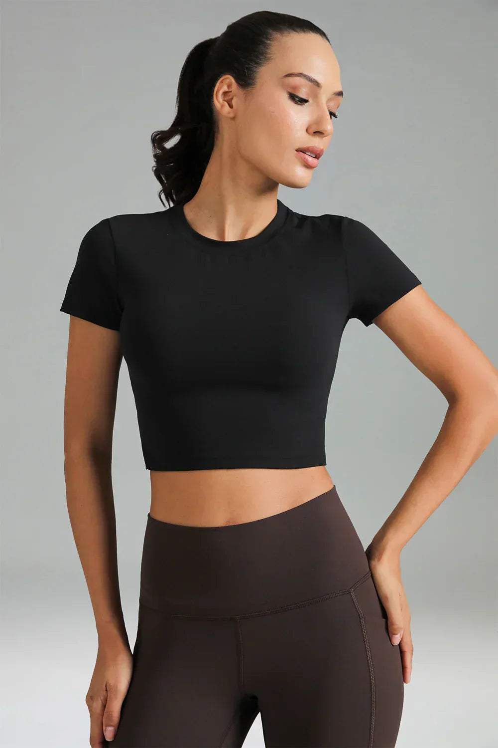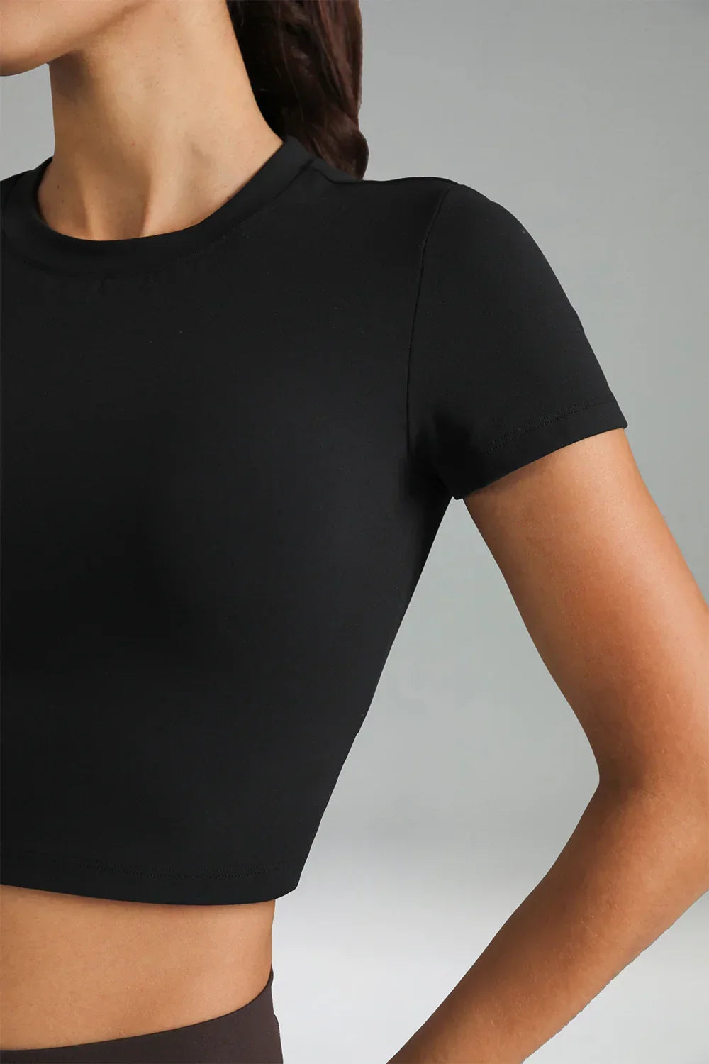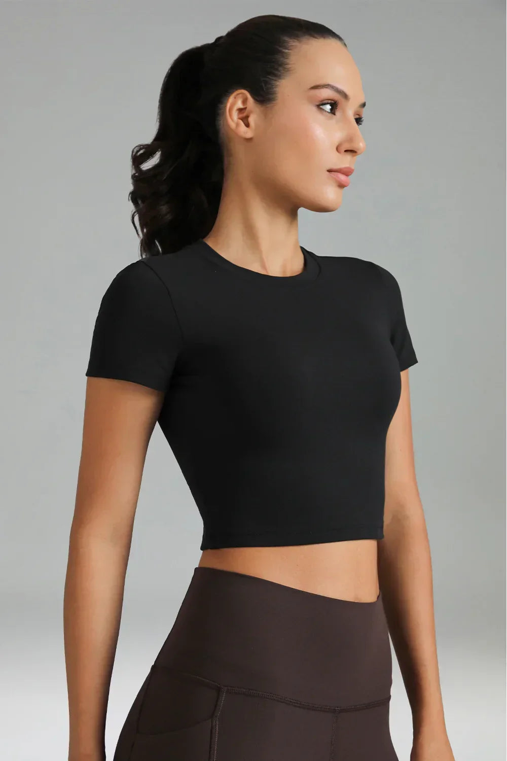 Lightweight and breathable, this short-sleeve cropped workout shirt keeps you cool and comfortable during running, dancing, or everyday wear.