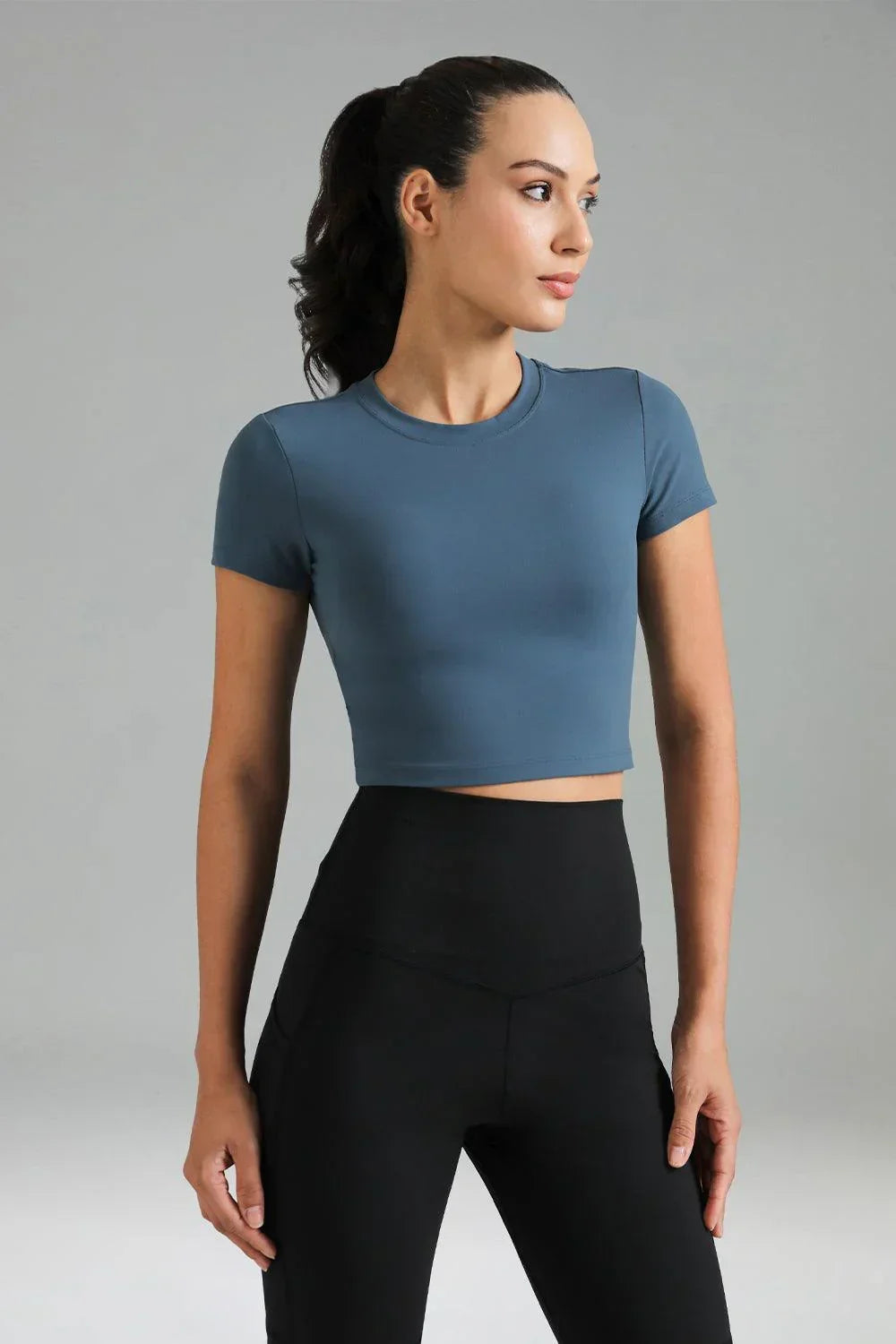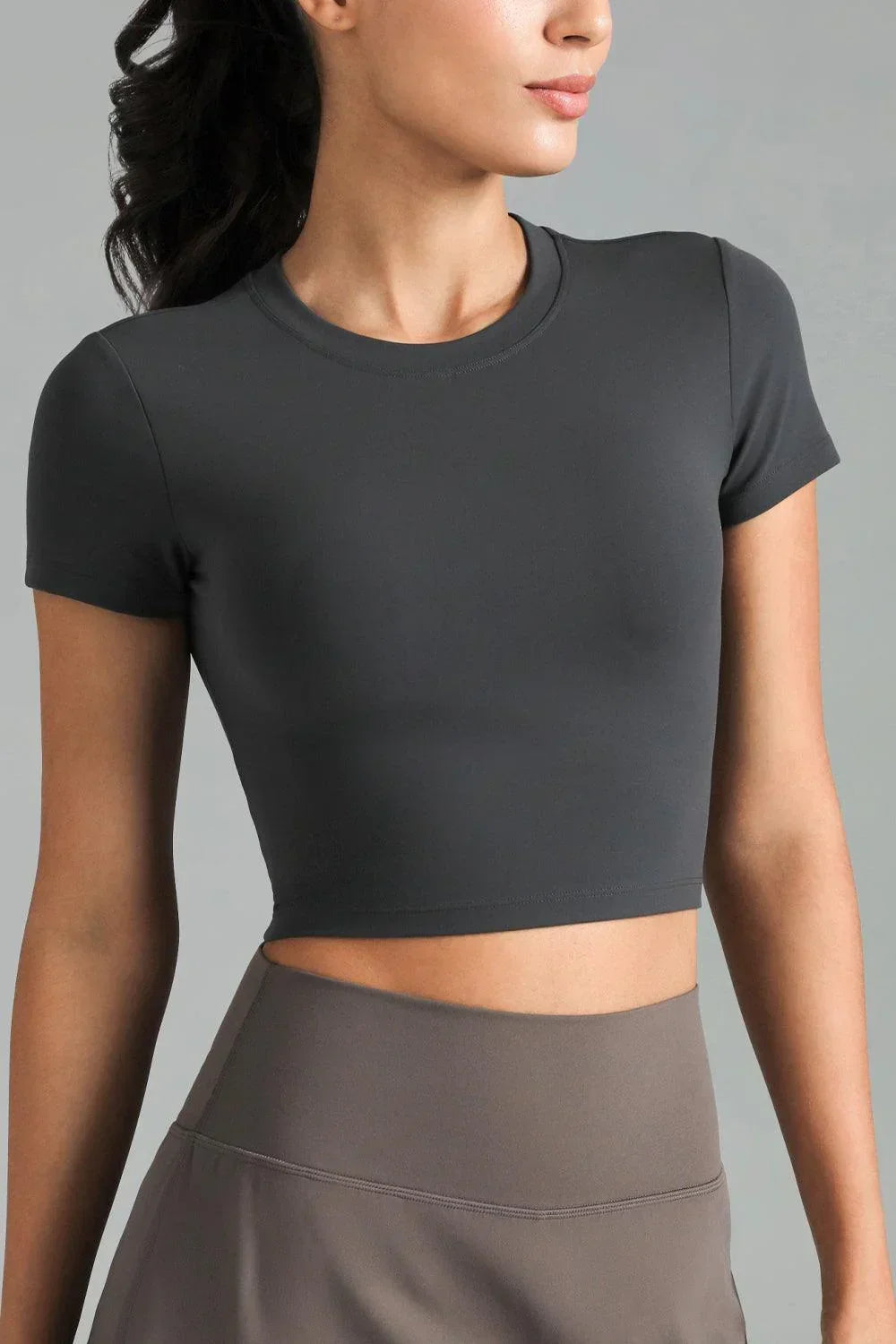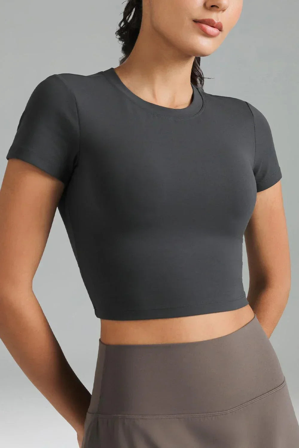 Lightweight and breathable, this short-sleeve cropped workout shirt keeps you cool and comfortable during running, dancing, or everyday wear.