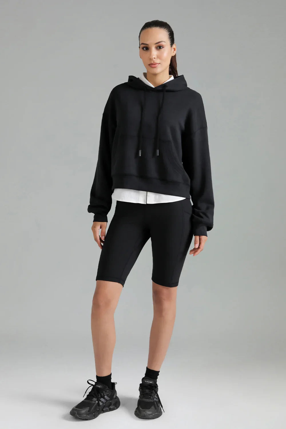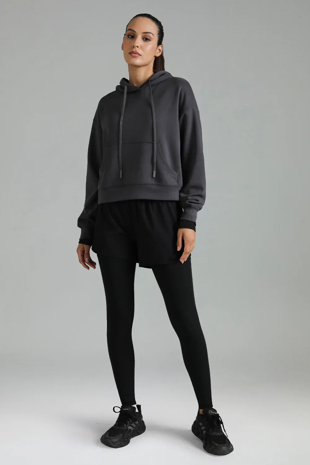 - This women's cropped hoodie combines style and functionality, ideal for layering during workouts or relaxed outings.